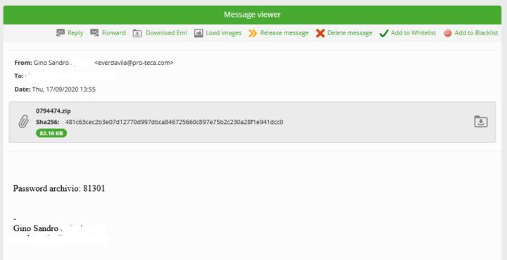 Così l’ultima campagna Emotet contro l’Italia prevede l’invio di una mail contenente in allegato un archivio zip protetto da password, e quindi non analizzabile dagli Anti Spam, dove si cela il file Office da cui parte l’infezione.