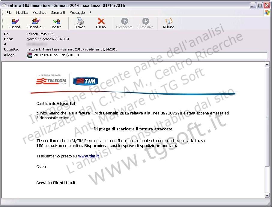 La nuova minaccia che si sta diffondendo proprio in questi giorni appartiene alla famiglia/tipologia CTB Locker ed è un Crypto-Malware nascosto dietro a una falsa email della TIM che come oggetto ha: “Fattura TIM linea Fissa – Gennaio 2016 – scadenza 01/14/2016“.