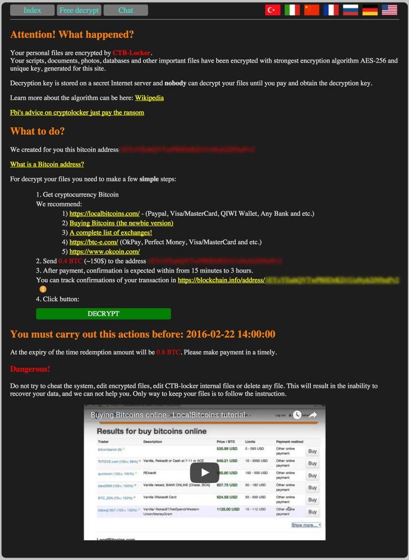 CTB Locker cifra i dati del sito web infetto con algoritmo AES256 e, per poter ripristinare il sito, chiede un riscatto di 0.4 bitcoin attraverso questo messaggio: