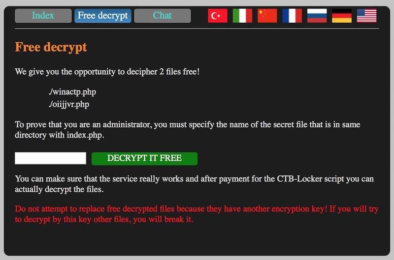 Una volta che CTB-Locker accede al root del webserver rinomina i file index.php o index.html con original_index.php o original_index.html, sostituendoli al sito web originale che di conseguenza ai visitatori mostra la seguente schermata: